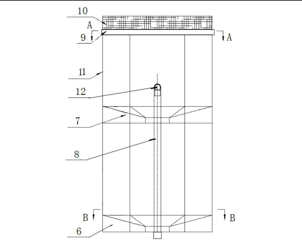 所述的旋流葉片每層為六支,即左旋葉片7和右旋葉片6分別為六支,六支葉片均勻分布在外殼11的六個梯形斷面上。