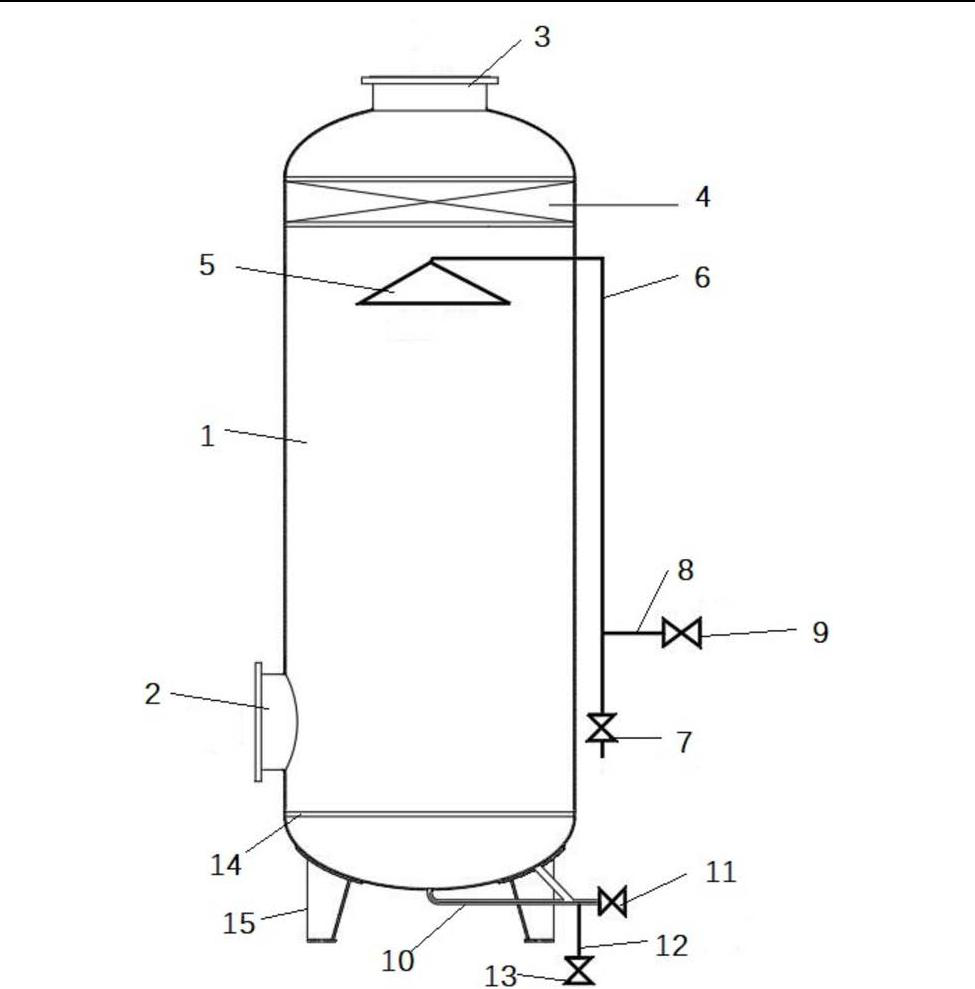 其中,1、分離器罐體;2、氣體進口;3、氣體進口;4、絲網除沫器;5、水洗噴頭;6、循環水進水管;7、水進管電磁閥;8、原料氣吹灰管;9、吹灰管電磁閥;10、循環水出水管;11、出水管電磁閥;12、原料氣反吹管;13、反吹管電磁閥;14、水位監控裝置;15、支撐腳。