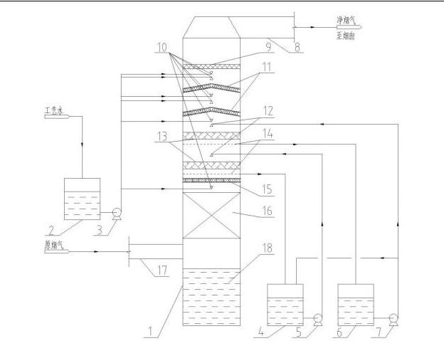 [0016] 圖中:1 .脫硫塔,2 .工藝水罐,3 .工藝水泵,4 .一級循環水罐,5 .水洗泵,6 .二級循環水罐,8 .凈煙氣煙道,9 .絲網除沫器,10 .沖洗水噴淋頭,11 .屋脊式除霧器,12 .水洗布液器,13 .水洗填料,14 .氣液分離器,15 .脫硫液除霧器,16 .脫硫段,17 .煙道,18 .漿液儲存區。