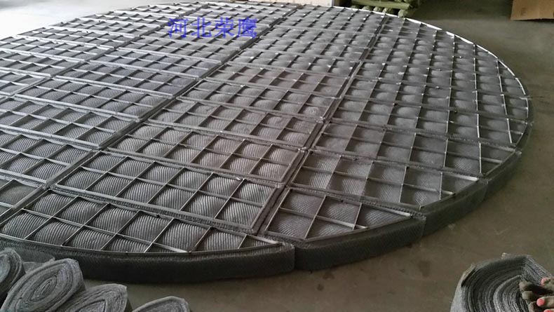 根據介質粘度的不同和液沫脫除要求的不同 ,絲網除沫器一般采用線徑為 0.25 ~ 0.30 mm 的合金絲,線間距約為 6 mm,編織成圓筒狀 ,再把它展平成寬度為 300 ~ 450 mm的帶狀絲網, 用數塊或數十塊網板重疊 ,捆以金屬絲 ,置于容器內格架上, 氣流自下而上通過絲網層 。絲網除沫器型式上分類:SP型(標準型)絲網除沫器、DP型(高效型)絲網除沫器,HP型(高穿透型)絲網除沫器。